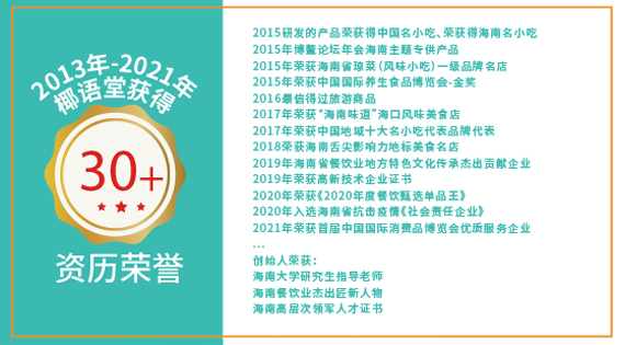 椰語(yǔ)堂公司介紹 椰語(yǔ)堂始創(chuàng)于2012年,是海南一家把海南清補(bǔ)涼為代表的特色小吃精致化、標(biāo)準(zhǔn)化并進(jìn)行連鎖發(fā)展的企業(yè),椰語(yǔ)堂專(zhuān)注于海南本土地域特色元素特別是椰子系列產(chǎn)品的深度研發(fā)。椰語(yǔ)堂被評(píng)為海南風(fēng)味小吃一級(jí)品牌名店,椰語(yǔ)堂多款小吃被評(píng)為海南名小吃、中國(guó)名小吃,并被選為中國(guó)地域十大名小吃代表品牌。椰語(yǔ)堂的全國(guó)門(mén)店分布在各高端商場(chǎng)、機(jī)場(chǎng)、郵輪、五星級(jí)酒店、動(dòng)車(chē)站、景區(qū)等。椰語(yǔ)堂清補(bǔ)涼被選為博鰲亞洲論壇專(zhuān)供產(chǎn)品、中國(guó)國(guó)際養(yǎng)生食品博覽會(huì)金獎(jiǎng)等殊榮,椰語(yǔ)堂清補(bǔ)涼在線(xiàn)下各連鎖賣(mài)場(chǎng)、盒馬鮮生、中石化易捷、中石油昆侖、全國(guó)30多家機(jī)場(chǎng)、五星、七星酒店等渠道銷(xiāo)售并成為政府及集團(tuán)采購(gòu)產(chǎn)品。在電商線(xiàn)上渠道,椰語(yǔ)堂椰奶清補(bǔ)涼無(wú)論在銷(xiāo)量和好評(píng)方面是品類(lèi)第一,是深受消費(fèi)者喜愛(ài)的高品質(zhì)產(chǎn)品。椰語(yǔ)堂是海南大學(xué)食品學(xué)院研究生實(shí)習(xí)基地,公司發(fā)揮椰語(yǔ)堂研究院優(yōu)勢(shì),擁有產(chǎn)品研發(fā)方面的多項(xiàng)專(zhuān)利。椰語(yǔ)堂因?yàn)槠鋬?yōu)秀品質(zhì)及良好顧客體驗(yàn),被中央電視臺(tái)、湖南衛(wèi)視、旅游衛(wèi)視等多家衛(wèi)視、人民日?qǐng)?bào)、中國(guó)縣域經(jīng)濟(jì)報(bào)、新浪、騰訊、SSBD等國(guó)內(nèi)外媒體報(bào)道宣揚(yáng)。椰語(yǔ)堂是海南文化的傳播和弘揚(yáng)者,是海南地標(biāo)美食品牌的優(yōu)秀代表和海南地域文化的一張亮麗名片,同時(shí),椰語(yǔ)堂也是中國(guó)連鎖經(jīng)營(yíng)協(xié)會(huì)會(huì)員單位。 more |